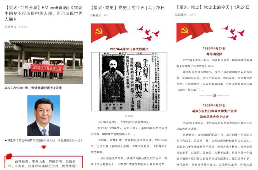 马克思主义学院“马院星火”微信公众平台推出的“党史上的今天”系列推文,坚持历史唯物主义和辩证唯物主义的基本立场和实事求是的态度,走进历史深处,用历史故事切入理论,用历史事件印证道理,由点及面、深入浅出,让值得记录与传承的精神、值得歌颂与赓续的品质直抵人心。“党史上的今天”推文中既有我们党的领导人对党在不同时期的历史回顾,也有对党史上重要人物、重要会议、重大事件的周年纪念以及经验总结,具有极强的政治性、思想性和可读性。